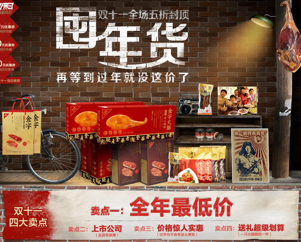 11月14日,在淘寶轟轟烈烈的雙十一活動(dòng)三天之后,金字火腿的工作人員終于把最后一批打包好的活動(dòng)商品搬到快遞公司的車輛上。與此同時(shí),淘寶雙十一火腿類目排行榜出爐,金字火腿毫無(wú)懸念?yuàn)Z得銷售冠軍。