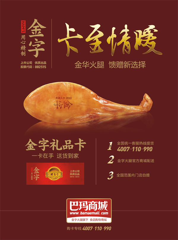 作為一家上市公司——金字火腿推出的禮品卡,禮品卡多年信譽,廣受消費者的真心歡迎,每年回頭客無數(shù),而更重要的是,金字每年把產(chǎn)品的品質(zhì)和備貨做到更好,禮品卡內(nèi)產(chǎn)品都是公司層層品質(zhì)歷練的熱銷產(chǎn)品,用火腿、臘肉、香腸這些實在心意,去感動每一位朋友。如今,更是可以通過手機微信關(guān)注金字火腿,盡享中華美食同時,與朋友分享禮品卡里所蘊含的真情實意。